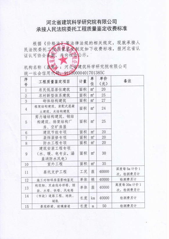 根據《河北省認證認可協會產品質量鑒定管理辦法(試行)》第36條、《河北省認證認可協會工程質量鑒定管理辦法(試行)》第35條“目前國家物價管理部門未對工程質量鑒定收費進行統一定價,鑒定機構應當公示本機構收費標準”之規定,我公司參照財政部財科教【2017】128號《中央財政科研項目專家咨詢費管理辦法》中的有關規定,并結合我公司產品質量鑒定和工程質量鑒定中鑒定專家工作的實際情況,制定了《河北省建筑科學研究院有限公司產品質量鑒定/工程質量鑒定收費標準》(見附件)。現予以公示。