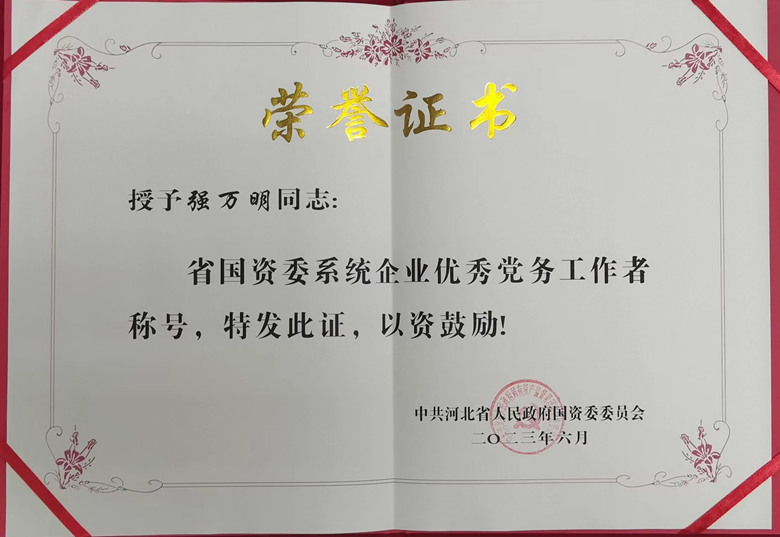 公司智能所支部委員會榮獲“先進基層黨組織”榮譽稱號;下屬公司冀科公司黨支部榮獲“黨建工作與生產經營深度融合先進單位”榮譽稱號;公司黨委書記、董事長強萬明同志榮獲“優秀黨務工作者”榮譽稱號;公司專職黨委副書記句德勝同志榮獲“優秀共產黨員”榮譽稱號。