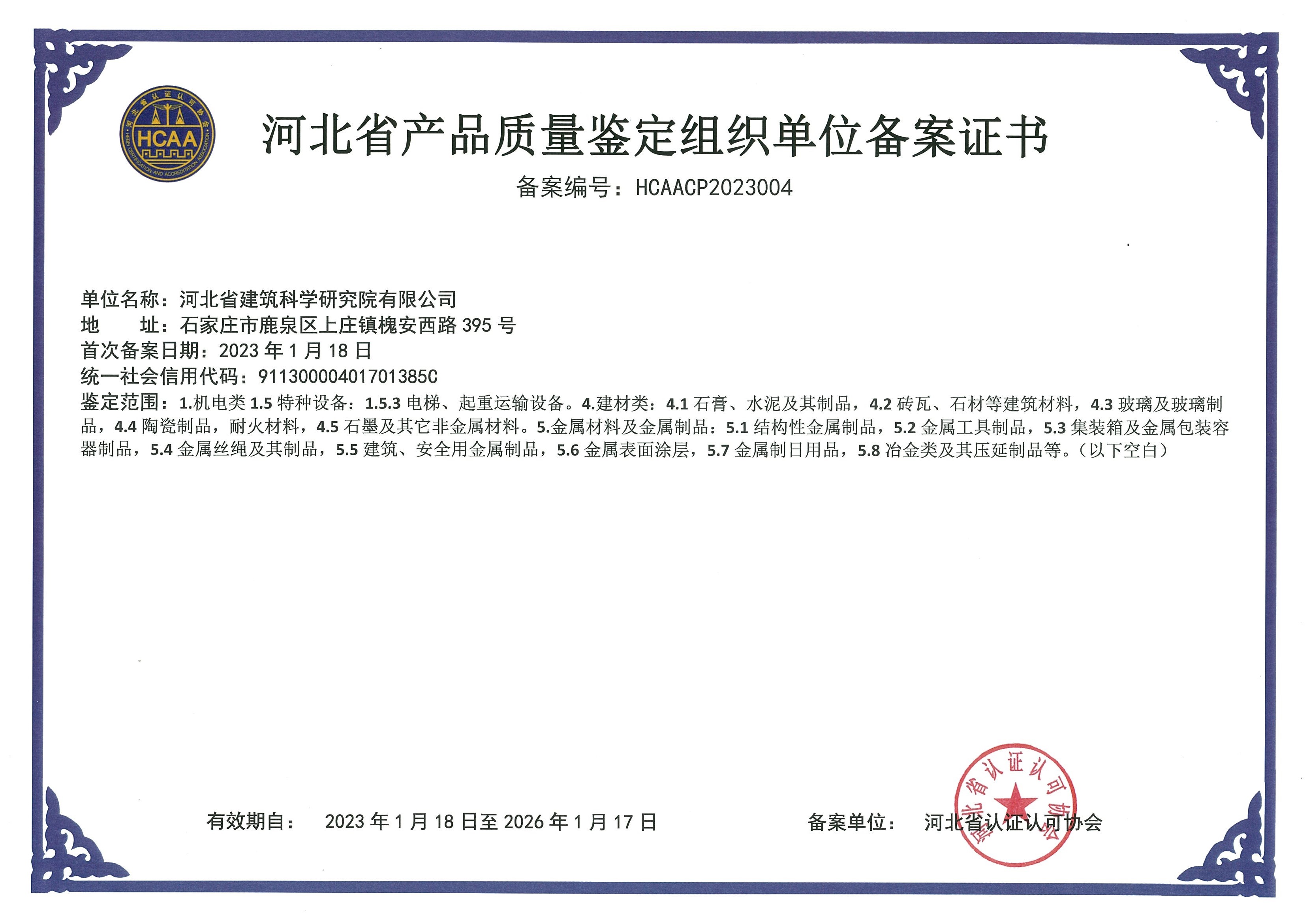 河北省建筑科學(xué)研究院有限公司產(chǎn)品質(zhì)量鑒定組織單位備案證書2
